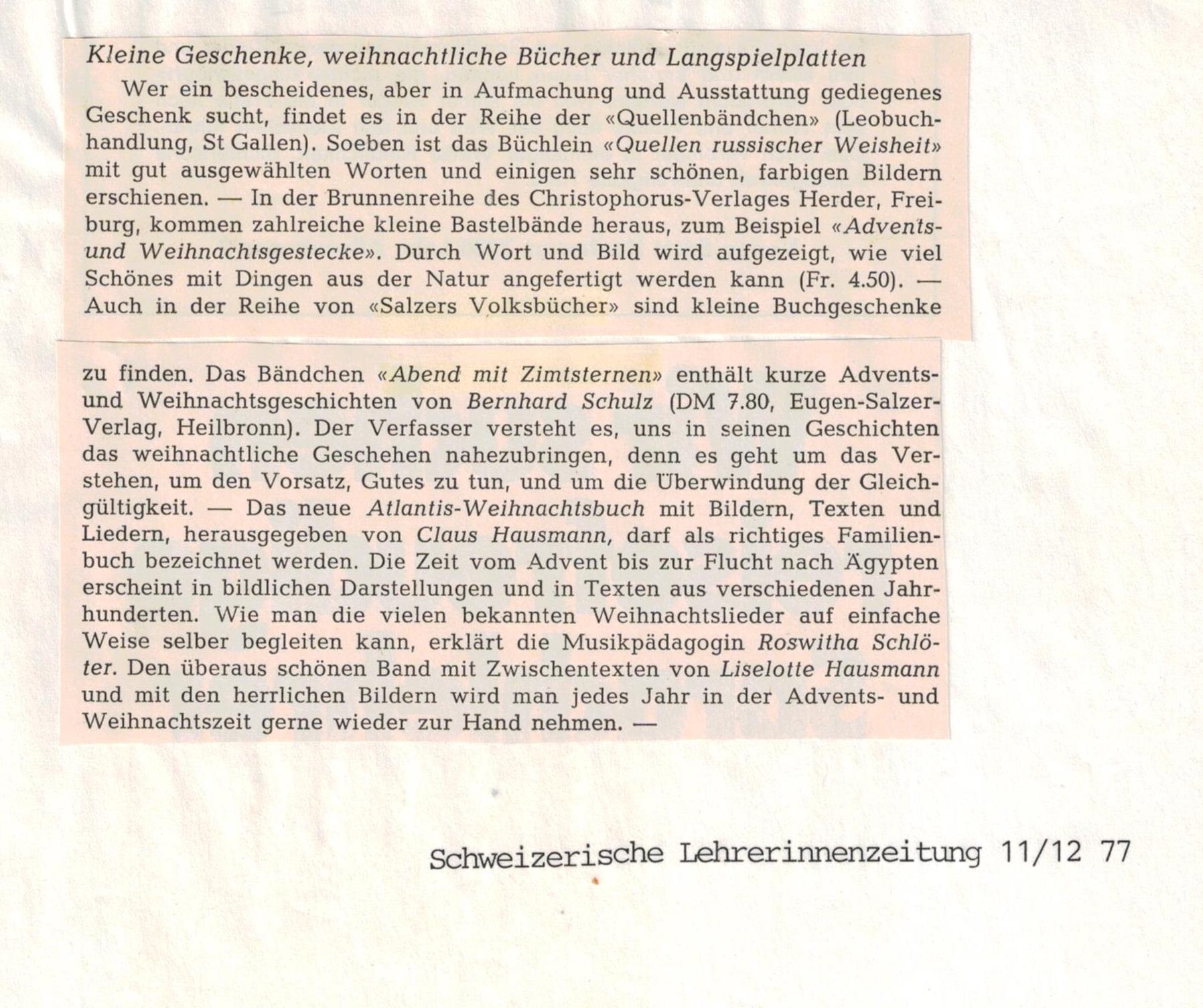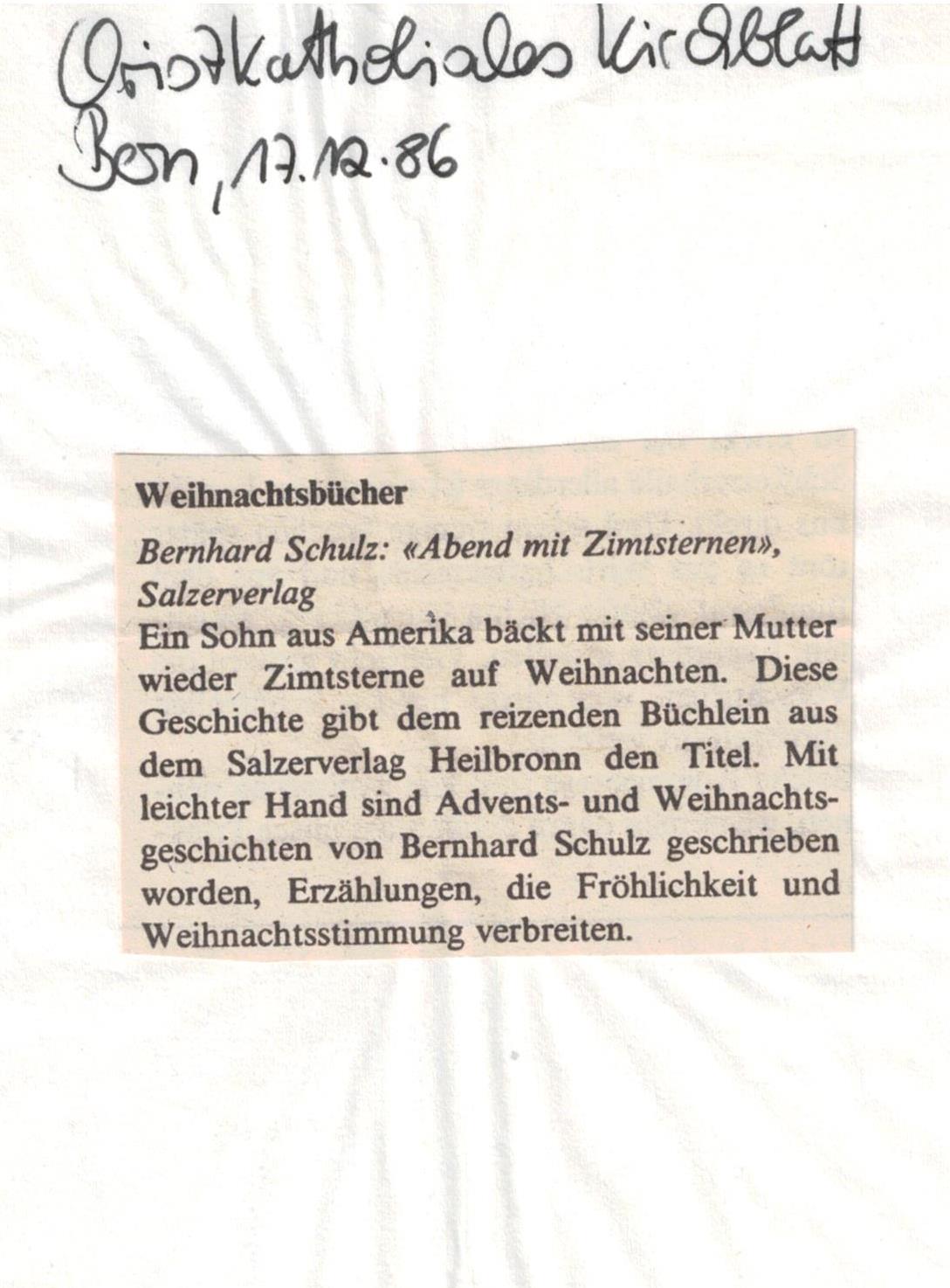 überglänzt wird. Damit hat uns Bernhard Schulz ein echtes Weihnachtsgeschenk gemacht, das die stillen Stunden