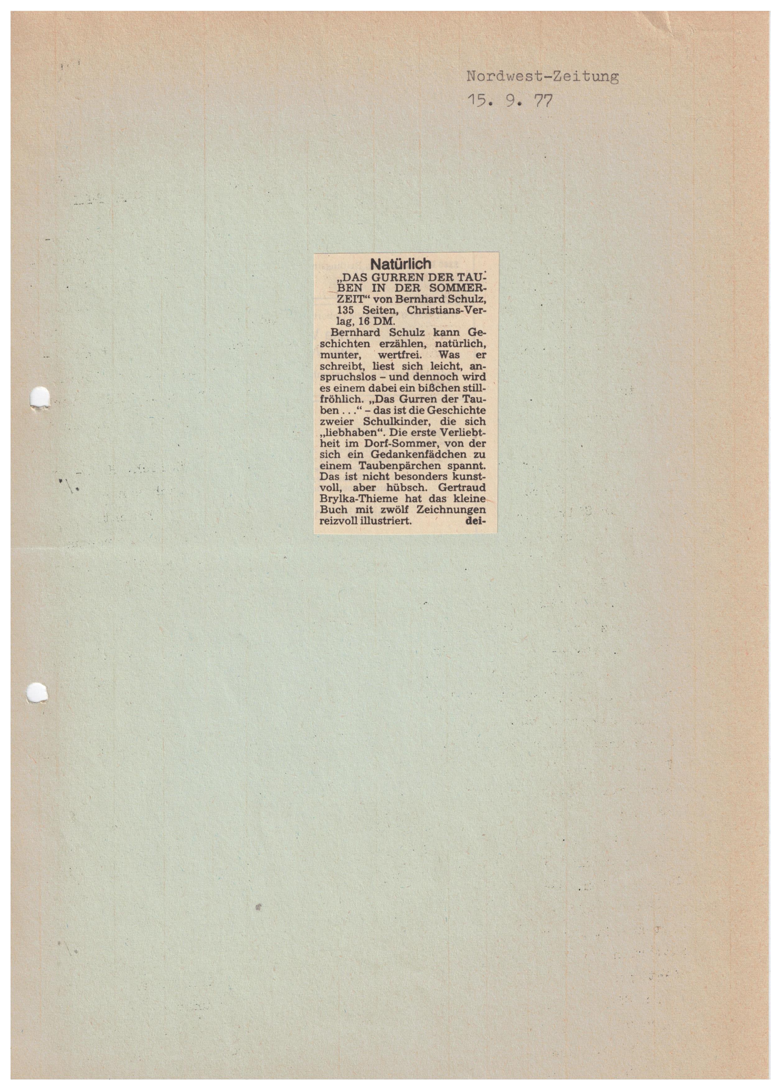 Schriftstellers Bernhard Schulz passt so richtig in die Jahreszeit: „Das Gurren der Tauben in der Sommerzeit",